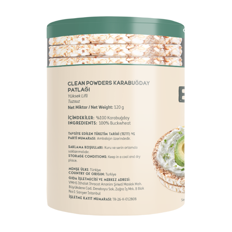 Clean Powders Buckwheat Cake; %100 karabuğdaydan üretilmiştir. Bir dilim (1 adet) Buckwheat Cake yalnızca 29 kcal içerir. İçeriğinde tuz bulunmaz ve her tarife kolayca adapte edilebilir. Ayrıca; vegan tüketime uygundur ve glutensizdir.