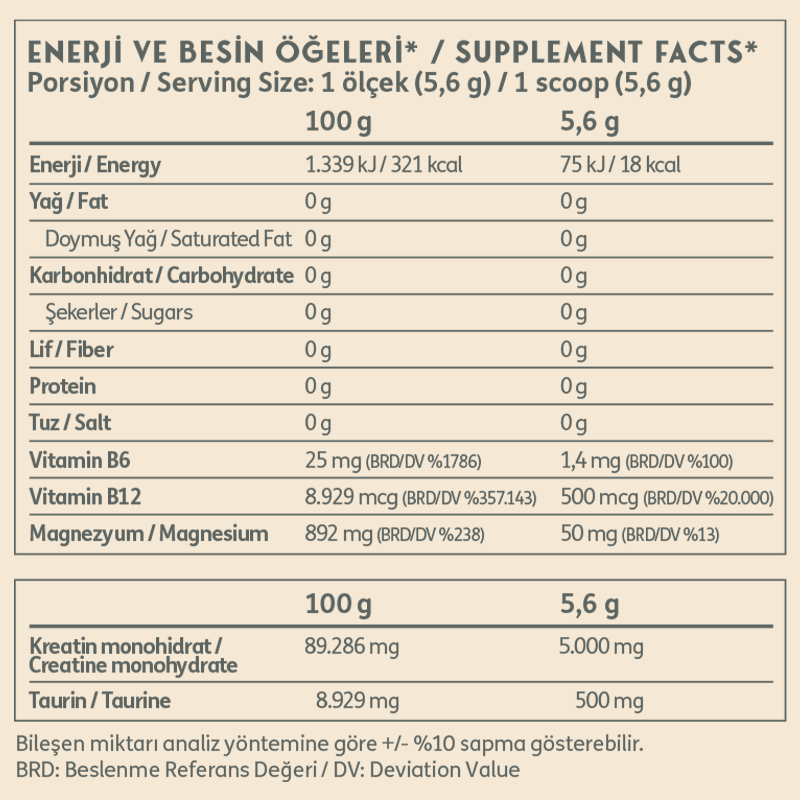 Clean Powders Crealife 168 Gr, her servisinde 5000 mg kreatin monohidrat sunan toz formda bir takviyedir. Kreatin içeriğine ek olarak 500 mg taurin amino asidi, 1.4 mg B6 vitamini, 500 mcg B12 vitamini ve 50 mg magnezyum sitrat minerali içerir. Ayrıca, Clean Powders Crealife, vegan beslenmeye uygunluğu ile öne çıkar.