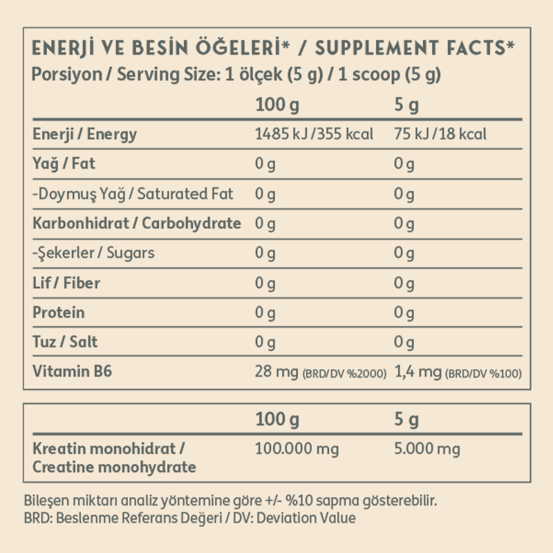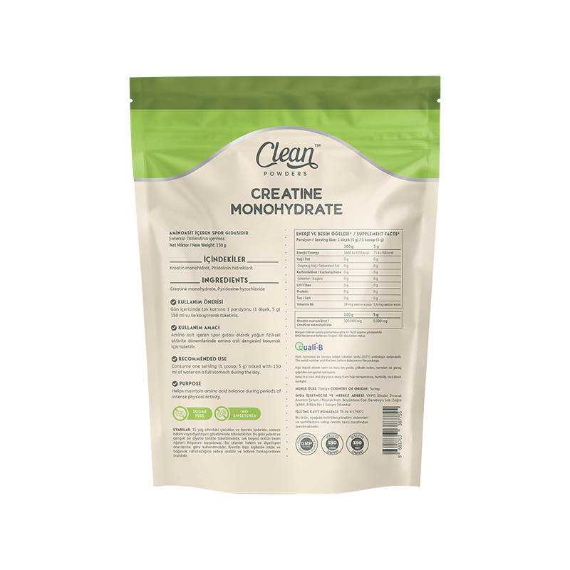 Clean Powders Creatine Monohydrate 150 Gr, mikronize kreatin monohidrat içeren, toz formda hazırlanmış bir gıda takviyesidir. Her serviste 5 g kreatin monohidrat sunan ürün, Vitamin B6 ilavesiyle desteklenmiştir. Aromasız yapısı sayesinde su veya farklı içeceklerle kolayca karıştırılarak tüketilebilir. Vegan tüketime uygun olan Clean Powders Creatine Monohydrate, günlük kullanıma uygun pratik bir alternatiftir.