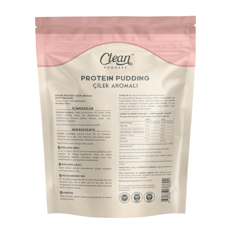 Clean Powders Protein Pudding, servis başına 20 g protein sunar. Bir servisi sadece 91 kaloridir ve sıfıra yakın şeker oranına sahiptir. Pratik bir şekilde hazırlanabilen pudding, yoğun fiziksel aktivite dönemlerinde protein dengesini korumaya destek olur.